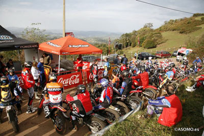 A las 8 de la mañana ya estaba la cabeza de la organización colocando las carpas y mesas de control además de los soportes publicitarios del patrocinador principal "Coca-Cola". La buena coordinación del delegado de trial de ASOMO, Manolo, que supo en todo momento como armonizar el equipo organizador aunado con la siempre inestimable y nunca bastante agradecida colaboración del Motoclub Cuenca Minera con su Presidente, José Manuel a la cabeza, permitió comenzar las verificaciones a la hora prevista, 9:30.