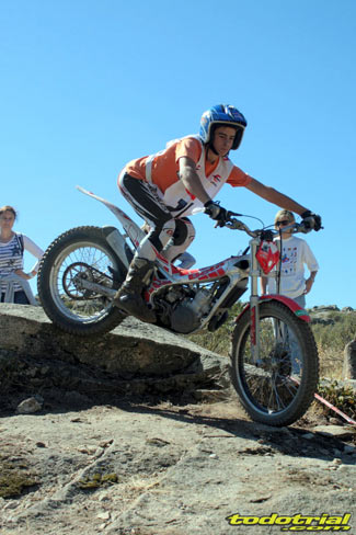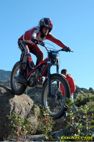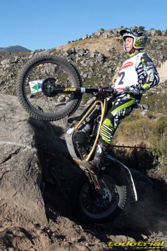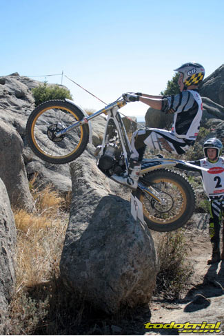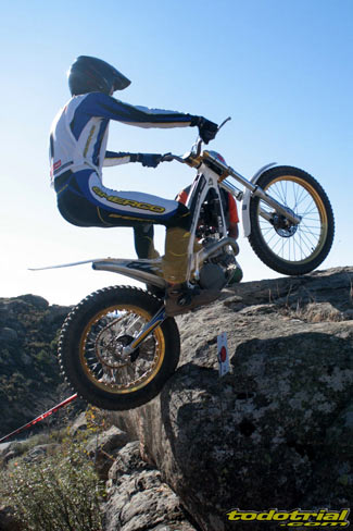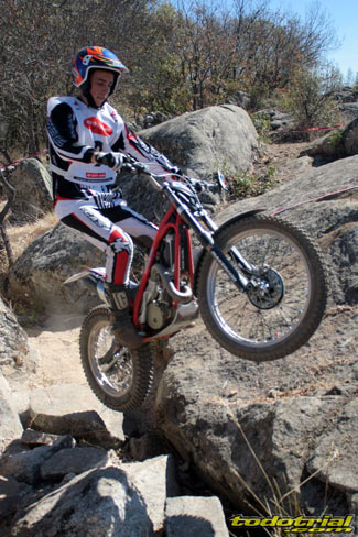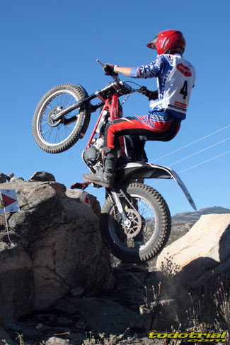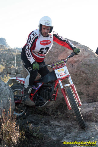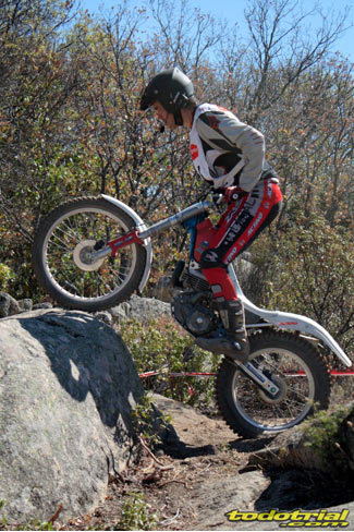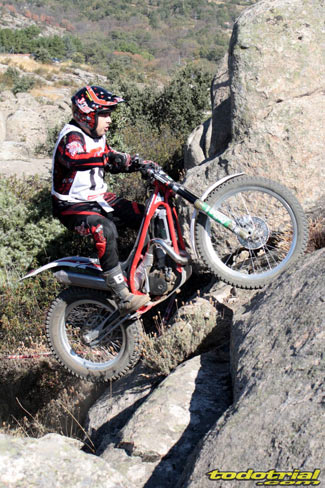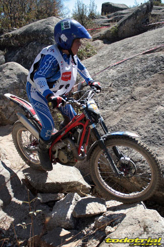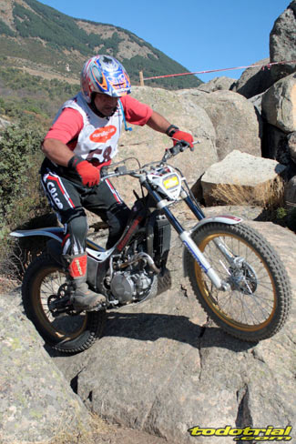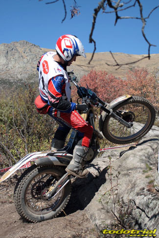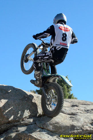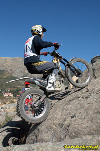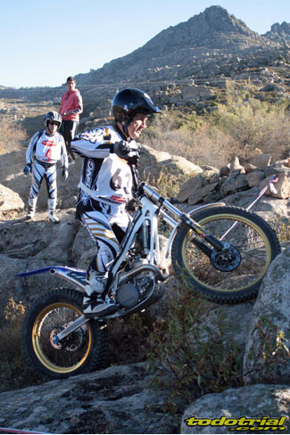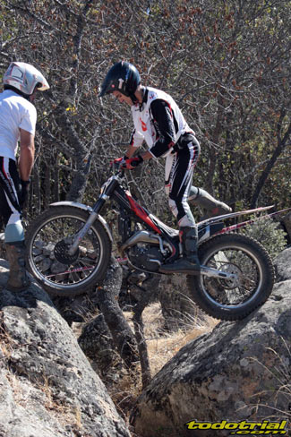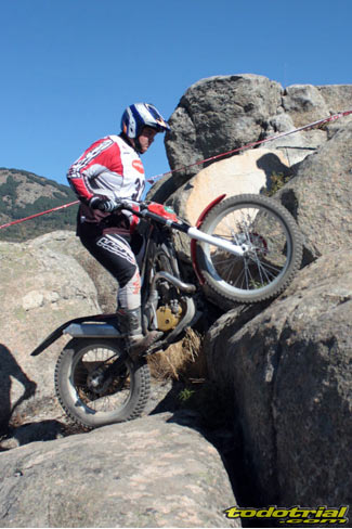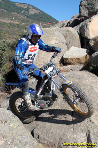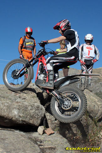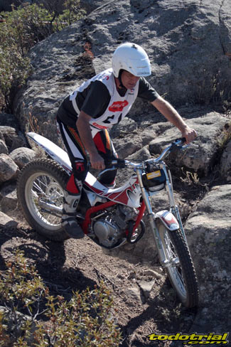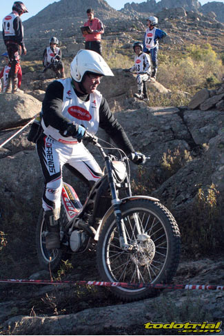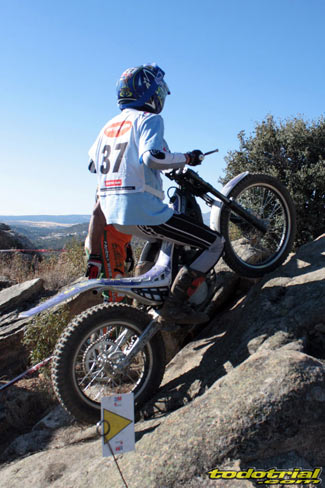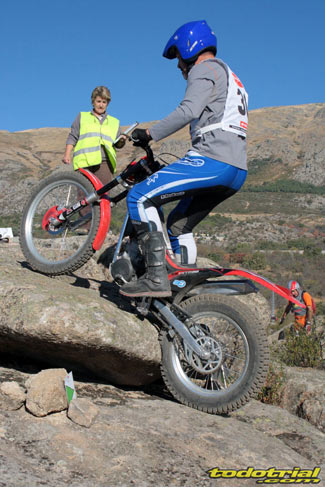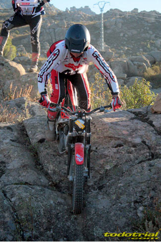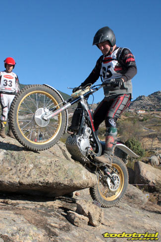 Ya lo comentamos en el reportaje anterior y ahora lo reiteramos, hay que facilitar el acceso a los jóvenes al trial, no como fórmula de crear campeones con zonas de gran nivel aptas para unos pocos sino todo lo contrario, haciendo que disfruten con zonas fáciles y adecuadas para todos, aunqeu empiecen a practicar trial con 16 años. Buenas zonas Esta vez el trial y las zonas gustaron mucho a todos los participantes, a diferencia de la cita anterior. El trabajo de marcaje de las mismas fue perfecto, con secciones largas y selectivas pero sin peligro, sin pasos ratoneros en los que rozar horquillas y estriberas, aprovechando perfectamente las grandes posibilidades del terreno que ofrece Valdemanco. Las zonas fueron variadas, aunque lógicamente predominando la piedra, con escalones, subidas y bajadas, pasos técnicos y giros, además de una zona compuesta de rampas de tierra muy resbaladiza. A destacar la espectacularidad de las zonas, sobre todo la última con grandes subidas y bajada sobre piedra, pronunciadas y de gran altura pero sin peligro gracias a lo adherente del terreno y al no estar marcadas al borde de cortados peligrosos. En estas el público podía ver la evolución de los pilotos cómodamente desde abajo. El nivel de las zonas era adecuado para cada categoría, y esto se refleja en las penalizaciones. Quizás en amarillos y verdes estuvo un poco más alto de lo habitual, mientras en azules bajó un poco respecto a Cabanillas situándose más en la línea de lo que era este nivel en años anteriores, aunque aún por encima, lo que hace que las inscripciones hayan disminuido. Mientras, en rojo el nivel fue perfecto para los cinco pilotos presentes.