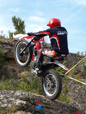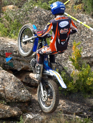 Daniel Santana no tuvo su día, y se vio lejos de la lucha por los puestos de delante. En ningún momento de la mañana se le vio cómodo sobre su Beta, y los espectadores podían constatarlo por el nivel de sus juramentos. Mario Micolau sufría en TR2, aunque al finalizar el trial todo fueron elogios para la organización, las zonas, más exigentes técnicamente le desgastaron, aunque permitiéndole disfrutar. 56 puntos en total, diez más que Santana. Jorge Remiro, con la nueva JotaGas afinaba en los pasos, pero se quedaba descolgado, su padre el incombustible Mariano, prefería ayudar a su hijo en este retorno a la competición. Raul Monfort se hundía en la clasificación por el lastre de excesivos fiascos en la primera vuelta. Por último, David Pérez, que pese a tener la mitad de 5 que Monfort, no supo lidiar las zonas más accesibles y no pudo bajar del 3. TR1, victoria de Héctor Gairín Las zonas para los TR1 fueron sin duda las más duras, el recorrido se marcó con la intención de exigir al máximo a los pilotos que vinieran a ganar esta carrera. La nota triste fue la ausencia de última hora de los dos excelentes pilotos del Matarraña David Millán y Sergio Puyo. Finalmente 5 pilotos completaron el recorrido y el de Castejón de Sos se mostró superior de principio a fin.