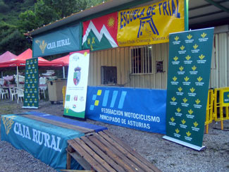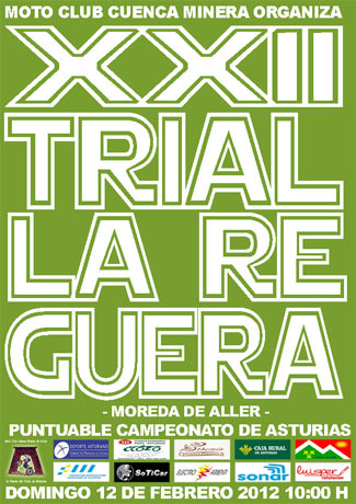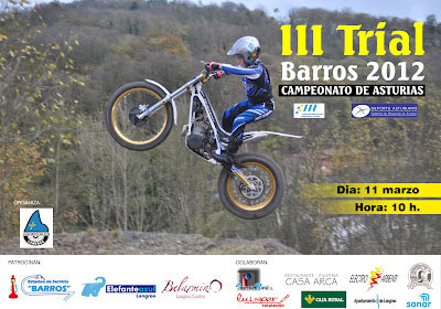 El Trial vuelve a la famosa reguera de Villanueva (Moreda de Aller) donde se han diseñado 7 zonas a la que los pilotos darán tres vueltas. El terreno escogido para que los pilotos muestren su nivel de preparación es de "mata" y "reguera". Más información en www.trialenasturias.com. Como las condiciones climáticas no han permitido nigún lujo al equipo de marcaje, se ha tratado de suavizar al máximo la dificultad de las mismas. Pero como casi siempre ocurre en estos casos el propio terreno marcará el nivel al que los pilotos deberán de enfrentarse. La Salida-Meta está ubicada en el campo de fútbol Lopez Doriga, contando con la colaboración del equipo local Santiago de Aller que nos presta sus instalaciones de bar, duchas, aparcamiento y demás servicios necesarios. Damos las gracias por su ayuda. Esta temporada seguimos contando con el patrocinio de Caja Rural de Asturias y van más de 20 años seguidos los que esta entidad bancaria y asturiana hace muy buena aportación para que podamos seguir organizando Triales. Otro de nuestros patrocinadores es el taller-tienda Moto Racing que a pesar de los malos momentos por los que atraviesa nuestro deporte y Asturias en general (gracias al empeño de algunos iluminados) sigue aportando todo lo que está en su mano. Al igual que Flores Bohemia que se empeñan en que no paremos de trabajar por y para el Trial. No nos olvidamos de nuestro Ayuntamiento de Aller que con el joven Concejal de Deportes Sr. Castrillo, parece decidido a poner los medios a su alcance a nuestra disposición. Bienvenido sea. Y como no, agradecemos la colaboración de Todotrial.com por publicar nuestros previos y reportajes.