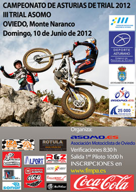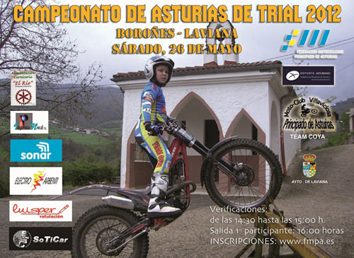 El Campeonato de Asturias de Trial 2012 vuelve a ponerse en marcha con la celebración del Trial de Laviana, el próximo sábado 26 de mayo, organizado por el Moto Club Villaviciosa. Será por la tarde comenzando las verificaciones a las 14:30 y hasta las 15:00. La salida del primer participante será a las 14:00. Como siempre las inscripciones se realizan a través de la web de la FMPA. www.fmpa.es.