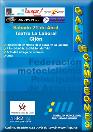 Todo comenzará por la tarde con la exposición de motos que habrá en el patio de La Laboral. El acto oficial se abrirá a las 20:00 horas con la Exhibición de Trial en el exterior y acto seguido la entrega de premios en el interior. Cerraremos el día cenando todos juntos, premiados y acompañantes que lo deseen y previa reserva. La asistencia a la gala es abierta a todo el público que desee asistir en el Teatro de la Laboral. En estos días se os informará de los pasos para reserva para la cena de después de la gala. A través de la web de la Federacion de Motociclismo del Principado de Asturias (www.fmpa.es) se habilitará un formulario para reserva y pago de la cena, para los que quieran asistir puedan confirmar el número de personas y hacer la reserva. Como se viene informando en reuniones anteriores solo recibirán invitaciones por correo ordinario los premiados que deberán confirmar su asistencia a través del formulario de confirmación premiados. A través de este comunicado os informamos que por supuesto todos los que disfrutamos del mundo de la moto estamos invitados a la gala. Los pilotos que hayan participado en competición en 2010 y 2011 pueden instalar sus carpas para exponer sus motos. Pero habrá horarios para preparar todas estas cosas del evento, así que el que lo desee puede ponerse en contacto con la FMPA. Esperamos veros allí y poder disfrutar de nuestro día de la Gala de Campeones todos juntos.