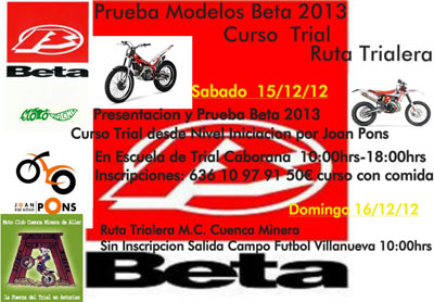 También se realizará un curso de trial de nivel iniciación a cargo de Joan Pons como monitor. Será en la Escuela de Trial Caborana desde las 10:00 horas hasta las 18:00. El curso con comida incluída tiene un coste de 50 Euros. Las inscripciones pueden hacerse en el teléfono 636 109 791. En la jornada del domingo más actividad trialera, con una Ruta organizada por el Moto Club Cuenca Minera. En este caso no es necesaria la inscripción y la salida se dará desde el Campo de fútbol de Villanueva a las 10:00 horas.