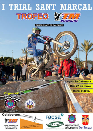 Se complementará con la ya conocida y consolidada "Retro de Marratxí" con exposición de motos antiguas, exhibiciones y venta de piezas de repuesto. Este trial está pensado para que el público pueda disfrutar de ver a los pilotos en las zonas marcadas por la organización, podrán aparcar sin ningún problema con el coche ya que se habilitará un parking al lado de ellas. Las categorías convocadas son: Elite, Master, Expert, Open, Open 125, Base 80, Base Automáticas e iniciación. Las verificaciones serán a las 8 horas junto a la Iglesia de Sant Marçal y el trial tendrá lugar de las 9,30 a las 13,30 horas. En la zona del Parking de Sa Cabaneta y ubicado en el mismo recinto donde se celebra la Retro de Marratxí, se montará el punto de control de la carrera con las instalaciones adecuadas, carpas, equipo de sonidos, mesas, etc Habrá un parking cerrado de motos con una zona de entreno para los más pequeños, base e iniciación, se pretende realizar una zona de exhibición y observar sus entrenamientos y el esfuerzo del día a día de los más pequeños. Se crearán cinco zonas en diferentes parajes y dos zonas indoor o artificiales con tubos, contenedores, rocas y obstáculos que pretende ser la zona de espectáculo de este I trial de San Marçal, todo ello animado por un speaker. Al finalizar la prueba se procederá a la entrega de trofeos y acto seguido, pilotos, acompañantes, organización, aficionados y simpatizantes podrán compartir mesa, donde se realizará una fideuá en la que si los acompañantes lo desean también podrán quedar a comer, habiendo tiquets a su disposición en la carpa de la organización. Esperamos compartir este domingo con vosotros. Os esperamos. Telefono de contacto: Juan Coll 635 030 494, email: carpinterjcoll@hotmail.com.