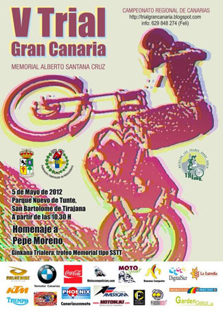Comienzan los preparativos del Memorial Alberto Santana. El V Trial Gran Canaria es la segunda prueba del campeonato regional de la modalidad, que tendrá nuevo escenario en esta edición. El día 5 de mayo en Tunte, San Bartolomé de Tirajana, comenzará la gran fiesta trialera del año. Muchas novedades en la participación con la nueva categoría de aficionados que tan buena respuesta dio en la primera prueba, realizada por el Moto Club Acero en Telde. Un campeonato que promete muchas emociones de rivalidad a lo largo de la temporada y que se define con el arranque directo de dos citas en Gran Canaria. El Moto club Las Palmas Roque Nublo, fiel al recuerdo y la memoria, elabora con mimo una cita grande, donde lo importante fue y será la filosofía que sembró Alberto Santana Cruz, fiesta para todos. Se buscaran fórmulas para que la participación sea numerosa, para ello se creó la Gimkana trialera de aficionados, con el Trofeo tipo SSDT Memorial Alberto Santana. Una pieza tallada en cristal, en cuya base se graba el nombre del ganador de cada año, cuando un piloto lo gane tres veces consecutivas la organización está obligada a darle una copia del trofeo Memorial al estilo clásico. Aunque el original seguirá creciendo en la base con la leyenda de sus ganadores para la historia. Gran tenderete trialero en las instalaciones del nuevo parque de Tunte. Un lugar adecuado para vivir una intensa jornada de Trial y familia. En próximos comunicados detallamos todas las novedades y sorpresas que nos tiene reservada la organización Ya sabes amigo aficionado, si estás animado a participar de esta fiesta, llámanos o ponte en contacto con nosotros, para informarte de los detalles del evento y requisitos. Todos son Bienvenidos, ¡Gran Canaria vive el Trial! Más información:trialgrancanaria.blogspot.com y en el teléfono de Feli Santana: 629 848 274.
