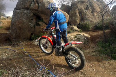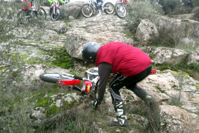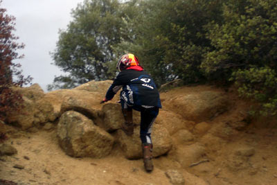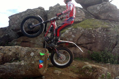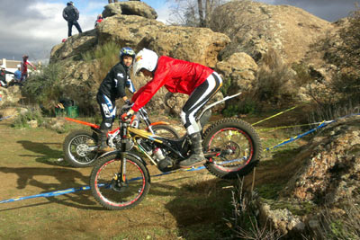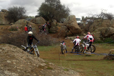 Marcos sólo se dejo 2 pies mientras que Nachete hizo 4 pies en las zonas mojadas sobre piedra y musgo del a priori complicado trazado del trial. Pero una vez más estos chicos hacen fácil lo que parece imposible y lo que nos parecía difícil resulto "fácil". Nuestro piloto local Julián Montalvo (lesionado) no nos pudo acompañar en este trial; aprovechamos para desearle una rápida recuperación, pues nos consta que ha sido seleccionado para iniciar unos cursos en Italia donde a buen seguro aprenderá muchísimo (ver sección noticias de Todotrial.com). En azules tuvimos también el honor de contar con el fántastico, piloto y mecánico en su día, del equipo oficial Montesa-Honda, Yanic Gunter. Su maravillosa 4RT y su estilo depurado y elegante solo le hizo dejar 4 pies sobre el trazado, en el pódium le siguieron dos pilotos locales, Samuel y Arenitas, que también nos demostraron su técnica y saber estar sobre la moto.