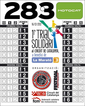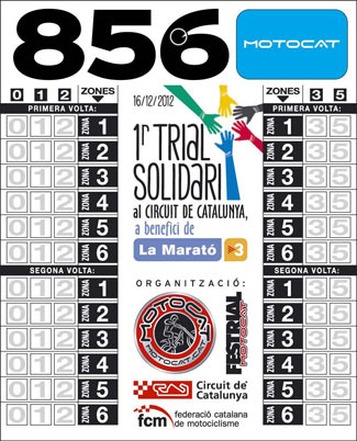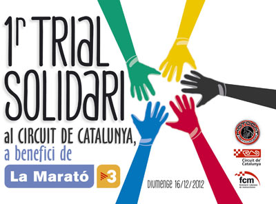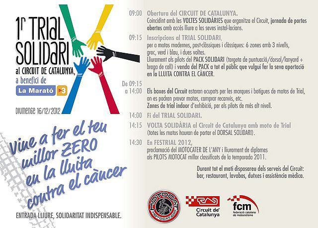 Pilotos, aficionados, familiares, amigos, simpatizantes ... iros preparando para hacer realidad vuestra solidaridad trialera el próximo 16 de diciembre... en el Circuit de Catalunya. Sí, lo habéis entendido bien, un trial dentro del Circuito. El Club Motocat pretende reunir en el circuito de Cataluña (con moto o sin ella) el mayor número de trialeros solidarios nunca visto, y para ello, necesita la "fuerza" de todos. Esta interesante iniciativa de Motocat cuenta con la colaboración del Circuit de Catalunya, la Federación Catalana de Motociclismo y La Marató de TV3. Y es que la edición 2012 de La Marató de TV3 se hará el mismo domingo del trial y estará dedicada a la LUCHA CONTRA EL CÁNCER, la principal causa de muerte de personas entre 35 y 70 años. Seguramente será un trial sencillo, pero el golpe de efecto que se quiere dar a nuestra querida especialidad, no tiene precedentes. Será un trial de seis zonas a dos vueltas para tres niveles: amarillo, verde y azul. Seguramente sin premios.