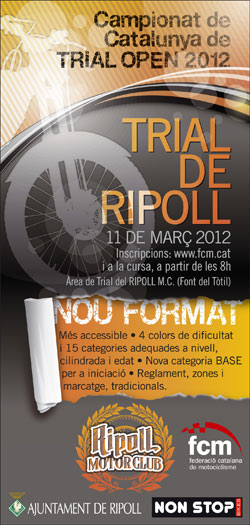 HORARIOS: A las 8:00 horas del domingo 11 de marzo se abrirán las inscripciones, aconsejamos que para dar mejor fluidez a los trámites administrativos, si es posible se inscriban en la web de la Federació Catalana. Se entregará una placa número que servirá para toda la temporada. A las 9:00 se dará la salida a los primeros participantes al Trial de Ripoll. Esta salida se efectuara por el orden que establece el reglamento de pruebas de trial marcado por la Federació Catalana de Motociclisme.