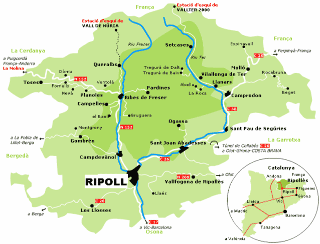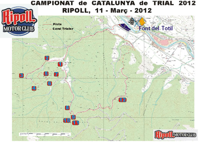 En coordinación con el representante de la federación catalana, se ha intentado dar un nuevo aire más adecuado para niveles de pilotaje de aficionado en el marcaje de las zonas, de aquí los 4 niveles de dificultad. Sabemos que las comparaciones no hacen justicia, pero para que los aficionados y los que hace poco que montáis en una moto de trial podáis elegir vuestro nivel óptimo y podamos todos mejorar gradualmente, diremos que el nivel amarillo, el más asequible, va a tener una dificultad similar al amarillo en clásicas, zonas muy seguidas con giros espaciosos y pocos escalones. El nivel verde, va a tener un nivel parecido con el verde de clásicas, también muy seguido, pero más ratonero y con algún escalón nada peligroso, sin finales abruptos ni pasos demasiado obligados. El nivel azul va a estar más acorde con los niveles inferiores que se marcaban en los triales de modernas antes del OpenFree, evidentemente ya exigiendo un pilotaje más fino en el posicionamiento de la moto. Y en el nivel rojo, vamos a intentar que nuestras jóvenes promesas y los no tan jóvenes pero bregados pilotos no se aburran y que sin peligros desmesurados puedan disfrutar de los trancos y pasos más complicados para que suba su nivel competitivo y preparatorio para afrontar nuevos retos de más alto nivel. Esta prueba se va ha celebrar el próximo día 11 de Marzo del 2012 y su recorrido va a transcurrir íntegramente por el área de trial que gestionan el Ayuntamiento de Ripoll y el Ripoll Motor Club en los parajes de "Els tres plans" y laderas del Catllar, efectuándose la salida del mismo desde la explanada de "La Font del Totil". Para llegar a Ripoll sirva este mapa esquemático de situación: