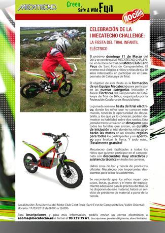 El objetivo de esta fiesta es la formación de un Equipo Mecatecno para participar en las nuevas categorías Iniciación y Alevín Eléctricas del Campeonato de Catalunya de Trial de Niños, organizado por la Federación Catalana de Motociclismo. Mecatecno quiere aportar su granito de arena para que la inclusión de las nuevas categorías eléctricas sea un éxito. La jornada será una fiesta del trial eléctrico, donde los niños que no conocen este mundo tendrán la oportunidad de descubrirlo, y los que ya lo conozcan podrán demostrar su habilidad sobre dos ruedas. Esta jornada transcurrirá con un desayuno para todas las familias que asistan, un cursillo de iniciación al trial donde los niños probarán las motos en un circuito, regalos para todos los participantes y un aperitivo para finalizar la fiesta. Y todo esto ¡Totalmente gratuito! Según la Federación Catalana de Motociclismo, la gran novedad de esta temporada en el Campeonato de Trial de Niños de Catalunya, es la inclusión de las motos eléctricas, que ya funcionan en el extranjero y que según el delegado de la Federación, Josep Serra, "ya teníamos que incluir en nuestros campeonatos". Mecatecno dará facilidades a todos los niños que quieran participar en el campeonato con descuentos muy atractivos y asistencia técnica en todas las carreras. Habrá zona de bar y tienda de productos oficiales Mecatecno con importantes descuentos para todos los asistentes. Además, para niños de 2 a 5 años, se dispondrá de motos más pequeñas (modelo T-8) que podrán probar y dar sus primeros pasos sobre 2 ruedas. Se recomienda que los niños vayan con casco, botas, guantes y el resto de equipamiento adecuado para la práctica del trial. Si no disponen de este material, habrá un servicio de préstamo de material a parte de la tienda. Para inscripciones y para más información, podéis enviar un correo electrónico a acoma@mecatecno.es o llamar al 608 581 165. (Inscripciones previas obligatorias, aforo limitado).