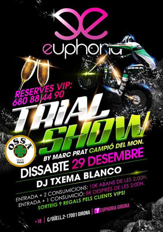 El próximo sábado 29 de diciembre tendrá lugar en la discoteca Euphoria de Girona una exhibición de trial a cargo del piloto oficial de Ossa Marc Prat. En el cartel adjunto encontraréis los detalles para pasar una noche de fiesta con trial incluído.