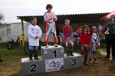Un buen presagio que no hace más que recompensar el esfuerzo de la FGM en la búsqueda de jóvenes "trialeros" para la modalidad y especialmente a la figura de Fernando Fernández "Nano" como promotor e impulsor de la iniciativa. En lo deportivo, esto es lo que sucedió en las dos categorías en liza: Alevines Como no podía ser de otro modo el valiente Chente López Perea Quiroga con su Gas Gas salió a ganar y en búsqueda de conseguir un nuevo título en la categoría con cinco de cinco victorias posibles, Pero en Teo las cosas no le fueron tan bien como esperaba, ya que se encontró con unas zonas algo más complicadas de lo habitual. De todos modos "Chentote" estuvo bien y superó los obstáculos con solvencia suficiente para lograr este nuevo campeonato para su palmarés. Esperemos que pronto reciba una ansiada moto con marchas… veremos que pasa.