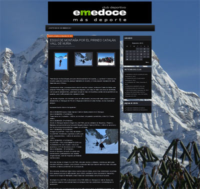 todos los aficionados a este deporte. Actividades de Montaña: En esta modalidad seremos más selectos, cambiando la cantidad por la calidad, organizando viajes de esquí de travesía en Pirineos y Alpes, con recorridos elegidos por el club y una planificación cuidada para que sólo tengas que preocuparte de encerar tus esquís. Queremos organizar viajes de esquí de pista, con la peculiaridad de que serán viajes para grupos reducidos y sin fecha concreta, aprovechando las nevadas que se produzcan, ofreciendo así, un tipo de viaje diferente, con el fin de sacar el máximo partido a nuestros días de esquí. Tienes más información en su web: Emedoce.wordpress.com.