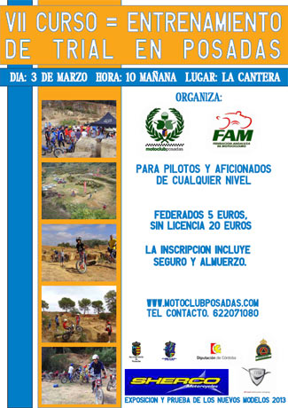 El próximo domingo día 3 marzo, la Federación Andaluza en colaboración con el Motoclub Posadas organizan una jornada de Cursillo - Entrenamiento de Trial para todos los pilotos y aficionados indistintamente del nivel y edad y modelo de moto. La actividad, que ya el pasado año tuvo una gran aceptación, se realizará en La Cantera, lugar emblemático de las pruebas de trial en Posadas y donde hay variedad de terreno para practicar giros, pendientes y todo tipo de escalones. El punto de encuentro será en la misma Cantera y la hora de reunión, las 9,30 para comenzar el entreno a las 10 de la mañana. El objetivo de la actividad es tener la oportunidad de realizar un día de entreno y disfrutar del trial en un ambiente distendido junto con amigos y aprovechar para ponernos un poco a punto. Esperamos contar con la presencia de pilotos de nivel como Sergio Moreno, Joaquín Salcedo, Pepe Serrano y David Fernández, que además de poder ver sus evoluciones, nos darán algunos consejos a los menos diestros. La organización dispondrá de avituallamiento a lo largo de la jornada y al término habrá un pikilabis para todos los participantes. PRUEBAS DE MODELOS 2013. Sera además una magnífica oportunidad para los participantes, para ver insitu los nuevos modelos de algunas marcas como Sherco y Jotagas, que desplazarán algunas unidades para pobrar estos nuevos modelos además de explicar sus virtudes y características.