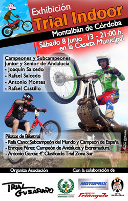 La actividad, promovida por la asociacion Trial Gusarapo, se desarrollará a partir de las 9 de la noche en las instalaciones de la Casta Municipal, en el recinto ferial de Montalbán, contando con la colaboracion del Ayuntamiento de Montalbán, el Motoclub Posadas y numerosas firmas y empresas locales. La exhibicion constara de trial indoor (moto) y trilasín (bici), contando en la sección de motos con la participacion de los pilotos cordobeses Joaquín Salcedo (subcampeón de andalucia absoluto), Rafa Salcedo y los prieguenses Antonio Montes y Rafa Castillo; todos ellos con un buen palmarés. En trial-bici, participará el subcampeon del mundo y campeon de España, Rafa Cano, que estará acompañado por Enrique Pérez y Antonio García. La organizacion montará un recorrido con zonas artificiales (contenedores, tubos y palets), en las que sin duda los participantes harán las delicias de los asistentes. A las motos y las bici, se unirá la música, sorteos y alguna sorpresa más que tiene preparada la organización para pasar una noche de sábado entrenida. Para ampliar la informacion podéis contactar con Emilio en el teléfono 686474659.