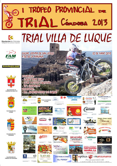 12 de Mayo El certamen contará con el apoyo de los clubes de los municipios mencionados, así como de sus respectivos Ayuntamientos y la Diputación Provincial, además de la Federación Andaluza de Motociclismo. Este es un Trofeo Open es decir abierto a todos los pilotos andaluces y de fuera. Para participar en las pruebas deberás estar en posesión de la licencia federativa (nacional, regional o provincial) de este año o si no sacar la de una prueba que estamos negociando con la FAM, para que sea asequible. La nueva Licencia provincial cuesta 120 Euros y con ella podrás correr las pruebas del provincial y los Dos Días de Posadas (total 5 días de competición). Se puede tramitar en la FAM www.famotos.com antes del viernes día 10, para participar en la primera prueba de este fin de semana de Luque. La organización correra a cargo del Trial Team Luque y el Club Motero Luqueño y tendrá a la Ermita de San Jorge y sus alrededores, como enclave de la prueba. La hora de comienzo será las 9,30 de la mañana y constará de un recorrido de seis zonas a tres vueltas. El precio de la inscripción sera de 20 Euros y deberéis pre-inscribiros telefónicamente o por email a través de cada organizador, con antelación a la prueba, para facilitar la organización, aunque el pago se hará en la prueba. Habrá cuatro niveles de dificultad, Rojo, Azul, Amarillo y Blanco o Libre, similares a los del andaluz, con el azul y rojo algo más suaves. Las categorías convocadas son TR1, TR2, TR3, TR4, Clásicas e Infantiles. En cada prueba habrá Trofeos para los 3 primeros de cada categoría. La clasificación final del trofeo, habra clasificación Open y Cordobeses. Para mas información de la prueba podéis contactar con Alberto en el teléfono 653992179 o en el email albertomotopepi@hotmail.com. Mapa de situacion: https://maps.google.es/maps?hl=es&tab=wl