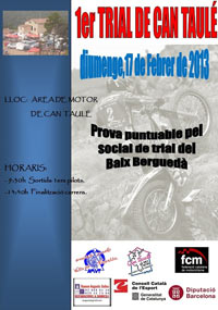 El primer Trial de Can Taulé representará la incorporación de esta disciplina a la actividad del área off-road que gestiona el moto club Amics Moto Valls de Torruella, donde después del Festival Solo Moto off-road del pasado diciembre, se acondicionó una zona montañosa y pedregosa para la práctica de esta especialidad tan arraigada en Cataluña. A las 9:30 h se efectuará la salida del primer participante y a las 13:30 h. está prevista la llegada de los últimos participantes. Para llegar hay que tomar la carretera C-55 Manresa - Solsona, Km 53,8. Las coordenadas son 41º 52' 52.40" N, 1º 43' 11.98" E. Tenéis más información sobre el Área de Motor de Can Taulé, mapa de acceso, etc, en su página web: www.clubamvt.cat/area_taule.html. Para más información se pueden dirigir al teléfono 629327394.