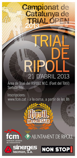 Tal como se establece en el reglamento de Trial de la FCM, el Trial constará de 12 zonas para las categorías Azul y Rojo y 10 zonas para las categorías Amarillo y Verde a realizar en dos vueltas al recorrido, con un tiempo máximo de 5:00 horas. Superado este tiempo se dispondrá de 10 minutos más, a razón de un punto de penalización por cada minuto de retraso. Para poder participar hay que tener la licencia Homologada, Catalana o la exclusiva de Trial que tramita la FCM. Las inscripciones se pueden hacer a través de la web de la FCM y también se podrán hacer el mismo día del Trial de 8 a 9 horas, donde también se entregarán los dorsales que serán válidos para todo el campeonato. En la mesa de verificaciones se dispondrá de un espacio para recoger el dorsal para aquellos que hagáis la inscripción previa en la web y una cola para los que os tengáis que inscribir el mismo día. Contamos también un año mas con la colaboración de NON STOP Bikes como sponsor principal de este campeonato. ¡¡¡ Os esperamos a todos al Campeonato de Cataluña de Trial Open 2013 !!!