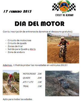 A partir de las 9 de la mañana, habrá desayuno para todos y después se podrá hacer un trial de entrenamiento con 6 zonas con el mismo reglamento y nivel que se aplicará en el nuevo Campeonato LLEIDA TRIAL 2013 que empezará el 17 de marzo. Será en el circuito de Motocross de Almenar, donde además de las zonas de trial se podrá rodar en el circuito de motocross, el circuito de quads y en la zona de enduro. También habrá una ruta para quads y ATV's y se podrán probar algunas motos modelo 2013. El precio para el trial y ATV será de 10 Euros, mientras para motocross, enduro y quads será de 20 Euros. Puedes solicitar más información en Quads Ponent, 25126 Almenar (Lleida). Tel. 973 770 622, Fax 973 771 415, www.quadsponent.com, www.facebook/quadsponent. Os esperamos a todos.