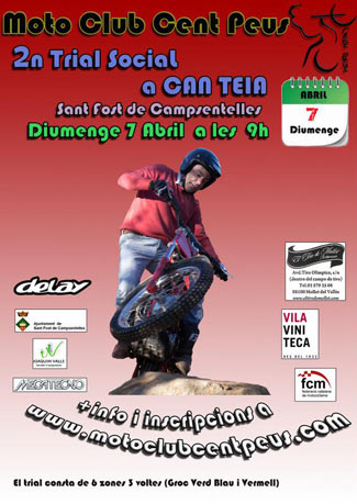 El próximo domingo 7 de abril a partir de las 9:00 el Moto Club Cent Peus organiza el segundo trial social de la temporada en Can Teià, Sant Fost de Campcentelles (Barcelona). El trial constará de 6 zonas a 3 vueltas, y tres niveles: Amarillo Verde y Azul. Más información, reglamento e inscripciones en la web del club: www.motoclubcentpeus.com.