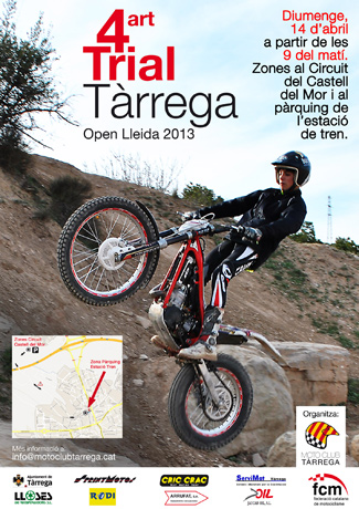 El próximo domingo día 14 de abril se disputará la segunda prueba del Campeonato Lleida Trial 2013 en Tàrrega. Para llegar a la salida (Circuito del Castell del Mor) se tiene que acceder por la Calle amics de l'arbre. A partir de las 8:30 desayuno e inscripciones y a las 9:30 inicio del trial. Como novedad, se han preparado nuevas zonas y se acercará el trial a la población con una zona en el aparcamiento de la estación. Os esperamos a todos.