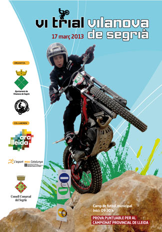 El próximo domingo 17 de marzo empieza el nuevo Campeonato Lleida Trial 2013, con todas las novedades anunciadas. La cita será en Vilanova de Segrià junto al campo de fútbol, a partir de las 8:30 con las inscripciones y desayuno para todos los pilotos, y a las 9:30 con el inicio de carrera. Recordamos que el precio de la inscripción és de 30 euros y que todos los pilotos pueden puntuar en la clasificación final, con cinco niveles de dificultad en cada zona. Al finalizar habrá entrega de premios y comida. Os esperamos a todos/as para este fantástico trial.