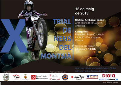 Esta, pues, será la tercera prueba de la Copa Catalana de Trial de Niños, ya que la que se iba a celebrar en Sucs (Lleida) se tuvo que anular debido a la lluvia. La competición se iniciará a las 10 de la mañana el próximo 12 de mayo y se alargará hasta las dos y media de la tarde, en que se hará la entrega de trofeos. El acceso a la zona donde se llevará a cabo la prueba estará debidamente señalizado. Esta competición cotará con la colaboración de los moto clubes y amigos de las Tierras del Ebro y con el apoyo de la Federación Catalana de Motociclismo, el Ayuntamiento de Amposta y el Área de Deportes municipal.