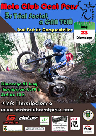 El próximo domingo 23 de junio el Moto Club Cent Peus pondrá en marcha su tercer trial social de la temporada en Can Teià, Sant Fost de Campscentelles (Barcelona). Las inscripciones comenzarán a las 8:30 y la salida del primer piloto será a partir de las 10:00. Más información e inscripciones en la web del club: www.motoclubcentpeus.com.