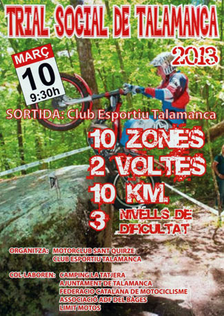 El Motor Club Sant Quirze junto con el Club Esportiu Talamanca organizan el Trial Social de Talamanca, que será el próximo 10 de marzo a partir de las 9.30h con salida desde el Club Esportiu Talamanca. El trial contará con 10 zonas y 2 vueltas a un recorrido de 10 kilómetros, con 3 niveles de dificultad.