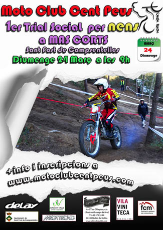 El próximo domingo 24 de marzo el Moto Club Cent Peus organizará su primer trial social de niños de la temporada en Mas Corts, Sant Fost de Campcentelles (Barcelona). El precio del trial para los socios del club será de 20 €, y para los no socios de 30 €, incluyendo desayuno. El trial constará de 8 zonas a 2 vueltas, y tres niveles: Amarillo Verde y Azul, también para motos eléctricas. Más información e inscripciones en la web del club: www.motoclubcentpeus.com.