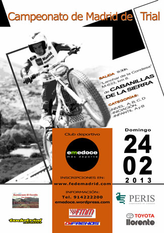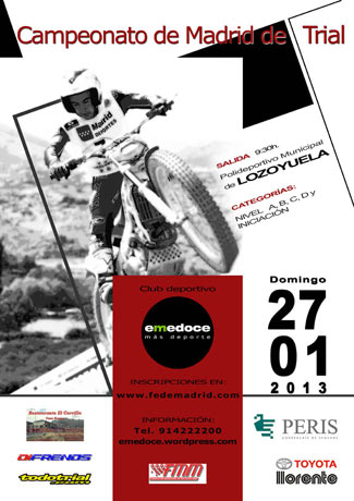 La cita será el domingo 27 de enero, a las 9,30 h., recordar a todos los participantes, que deberán tramitar su licencia federativa del año en curso, antes de proceder a realizar la inscripción a través de la web de la Federación Madrileña de Motociclismo, licencias que para la especialidad de Trial, presentan un importe significativamente inferior al de 2012, manteniéndose el precio de las inscripciones, buenas noticias para el trial madrileño. El recorrido tendrá aproximadamente 4 km., con 8 zonas, la salida desde el emplazamiento habitual en el Polideportivo Municipal de Lozoyuela, localidad ubicada en el km 65 de la A1. Para esta ocasión, la organización de Emedoce, marcará unas zonas de fácil ejecución para todos los niveles, por tratarse de la primera competición de la temporada. Asimismo, Emedoce presentará su particular "Zona Emedoce", donde los pilotos podrán disfrutar de un avituallamiento en la zona de verificaciones, acompañados por una selección musical, que será diferente en cada trial, siendo en esta ocasión la música de U2, la que amenizará la mañana. Coordenadas Polideportivo de Lozoyuela: UTM 30 T 448213 E 4530700. Más información en el teléfono 914222200, en la web del Club Emedoce o en la web de la Federación Madrileña de Motociclismo.