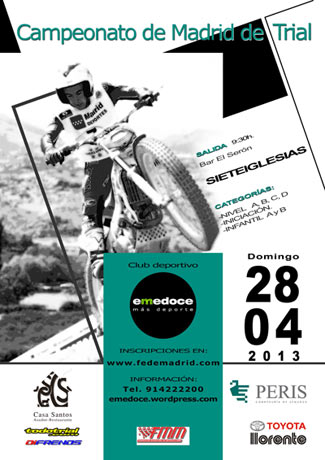 El próximo domingo 28 de abril, Sieteiglesias acogerá la cuarta prueba del Campeonato Comunidad de Madrid de Trial de Niveles así como del Trofeo Infantil, organizada por Emedoce. A continuación os detallamos información de interés de cara a la competición.