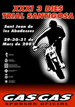 Freixa, Manzano, Pascuet y Justribó serán los máximos favoritos. Los próximos 29, 30 y 31 de Marzo se disputará la XXXI edición de los clásicos "3 Días Trial Santigosa". Se prevé una participación de más de 200 pilotos de todos los niveles. Hasta ahora ya han formulado su inscripción 170 corredores, entre los que destacan los mundialistas Marc Freixa y Marcel Justribó del equipo Otyan-Sherco, Jordi Pascuet y Jeroni Fajardo del equipo Gas-Gas, así como los pilotos Todotrial Josep Manzano, Dani Oliveras y Diego Garrido.