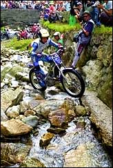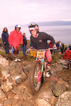 En ese punto del recorrido una intensa niebla envolvía todas las colinas escocesas, la vista no alcanzaba a ver la bandera siguiente que indicaba el recorrido y las huellas de las motos se dirigían en todas direcciones, algunos pilotos se perdían, otros optaban por tomar la dirección hacia donde iban la mayoría de rodadas. Según se descendía se llegaba a una cantera en la que se tomaba una pista de gravilla y después una estrecha carretera hasta llegar a la zona de descanso, 15 minutos para comer y beber algo con más calma.