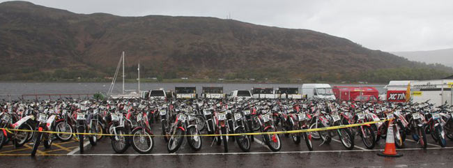 Ayer los marshalls que preparaban el recorrido para hoy trataban de señalizar el recorrido con las banderitas naranjas, pero veían que la mayoría de los tramos a través de los moors, se habían convertido en totalmente impracticables, pues el barro engullía las motos. La difícil interzona por Rannoch Moor y la gran vuelta hasta Lochs Wood no se podía hacer.