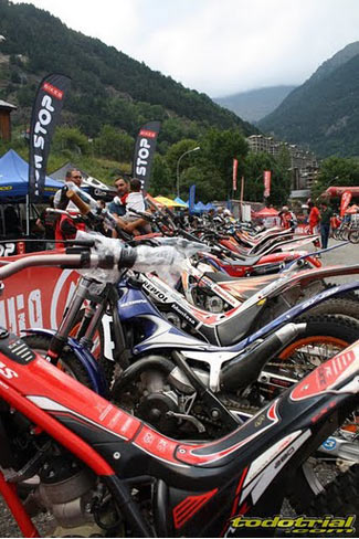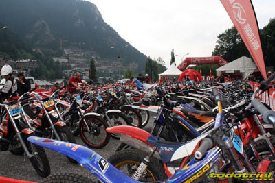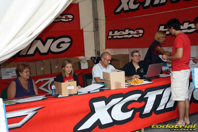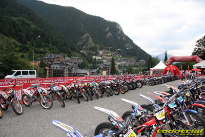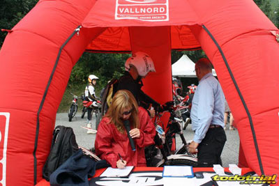 Este año el proceso de verificaciones e inscripciones se realizó perfectamente, sin las colas del año pasado. Durante toda la tarde fueron pasando los participantes y seguidores por la carpa de la organización de manera que no hubo aglomeraciones. Allí recibían el dorsal y la bolsa con la camiseta conmemorativa, el poster del trial, y algunos otros detalles de los principales sponsors, como son la estación de esquí Vallnord, Andorra Turismo o Minute Maid. Poco a poco el parque cerrado se llenaba con más de 200 motos, diferenciando a un lado las de los participantes y a otro las de los seguidores, con dorsal verde.