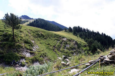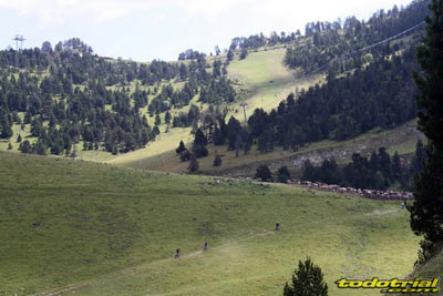 Comienza ahora una de las partes más duras del trial, la prolongada y empinada bajada hasta Bordes Seturia. Bajadas sobre estrechos senderos bacheados muy en pendiente, entre pinos y hierba en los que se te cargan las muñecas, las manos, la espalda, las piernas... Además es conveniente no ir frenando demasiado sino utilizando la retención del motor, ya que puedes sufrir el sobrecalentamiento del freno trasero y quedarte en un momento sin frenos. Muchos harán una o varias paradas, con tranquilidad, no hay prisas.