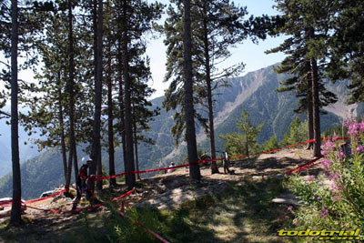 Desde este punto el recorrido era el ya conocido en cada edición y que caracteriza este trial, un camino empinado entre pinos a cuyo margen izquierdo está el límite de la montaña y desde cuya cima ya se aprecian vistas espectaculares. Este año no había zona marcada en la cima, por lo que el recorrido seguía hasta llegar a otra zona preciosa y técnica, la 4, una pendiente embarrada también al estilo scottish.