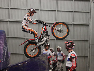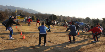 Foto 4.- calentamiento específico sería realizar la propia actividad a un ritmo ligero, o como veis en la foto, realizar ejercicios de equilibrios o pequeños movimientos sobre la moto.