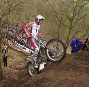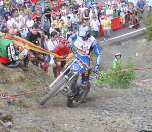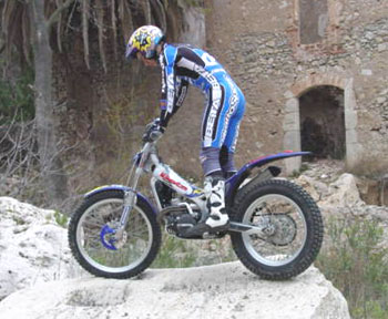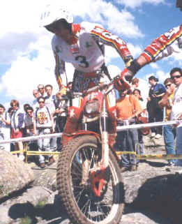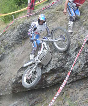 En la foto de la izquierda veis a Freixa en plena subida y además efectuando un pequeño giro, como se aprecia debe adoptar toda la teoría que hemos visto para los giros y para las subidas simultáneamente. Subida: cuerpo hacia delante, flexión de brazos y piernas, presión en la rueda trasera, Giro: moto inclinada hacia el interior, cuerpo hacia el exterior, rodillas en dirección al giro y hombros paralelos al manillar. Y por supuesto un dedo controlando siempre la maneta del embrague.
