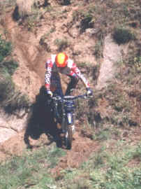 Aquí hay que hacer lo contrario que en las subidas, es decir, echad el cuerpo hacia atrás lo más posible con los brazos estirados, las piernas flexionadas, las rodillas abiertas y el culo casi tocando al guardabarros trasero. Controlad bien los frenos delantero y trasero hasta casi parar la moto, pero no bloqueéis ninguno de los dos, el bloquear la rueda trasera en las bajadas es un error, salvo en casos muy excepcionales. Así conoceréis cual es el límite del bloqueo de las ruedas y cogeréis mucho tacto de frenos. Fijaros en David Cobos, brazos estirados, culo muy atrás, rodillas dobladas y mirada al frente.