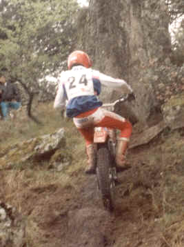 Así los primeros ejercicios consistirán en circular por el campo de pie intentando ir a veces lo más despacio posible, y otras veces haciendo aceleraciones y frenadas para acostumbrar el cuerpo a todas las reacciones de la moto. De vez en cuando podemos pasar alguna pequeña piedra o un terreno con piedras sueltas, en estos casos debemos flexionar el cuerpo al pasar los obstáculos y dejarle libertad de movimientos. La amortiguación de la moto absorberá las irregularidades del suelo, pero la amortiguación más importante es la que efectuemos con nuestros brazos y piernas, si por el contrario vamos rígidos cualquier movimiento imprevisto de la moto nos hará poner los pies en el suelo. En caso de que no seáis capaces de pasar por algún lugar sin apoyaros en el suelo, intentad poner sólo un pie, no os bajéis de la moto con ambos pies a la menor dificultad. En la foto de la izquierda veis cómo hay que flexionar los brazos y piernas al pasar obstáculos, son nuestros principales amortiguadores.