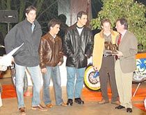 Precisamente una representación de estos pilotos de diferentes especialidades quiso añadirse a este acto para manifestar ellos también su reconocimiento a Viladoms. Los vemos en la foto son, de izquierda a derecha: Jordi Duran (enduro), Toni Elias (velocidad), Javier García Vico (motocross) y Josep Manzano (trial).