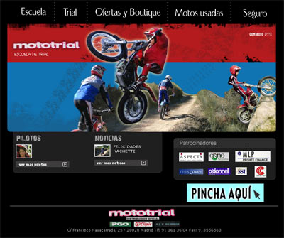 Destaca en ella un espectacular diseño de lo más trialero, con el piloto de Clipic Nachete Fernandez Sancho como principal protagonista. Encontraréis secciones como las ofertas y boutique, motos usadas, seguros, trial, y escuela Mototrial, con noticias sobre cursillos y pequeños pilotos Mototrial.