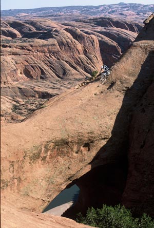 Moab, el Valle de los Arcos, el desierto de rocas, los impresionantes cañones del Colorado. Recorrer estos lugares tan impresionantes sobre una Scorpa TYS 175 F, con más de cuatro horas diarias de ruta y continuar al anochecer es una experiencia única.