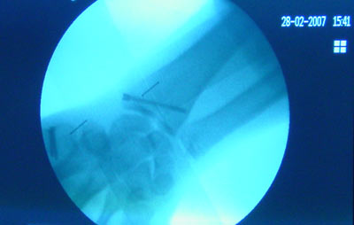 La exploración, una vez en Girona, el mismo domingo por parte del Dr. Centenera preveía que la lesión podía ser una fisura del radio de la muñera izquierda. Aun así, se le efectuó un TAC, para confirmar el diagnóstico. Ayer, lunes, por la tarde se confirmó la fisura, por lo que la posibilidad de recuperación pasa por hacer un tratamiento funcional o el paso por el quirófano para insertarle un tornillo que refuerce la zona afectada y facilite la recuperación.