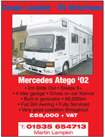 Se trata de un Mercedes Atego de 2002 con capacidad para dormir 6 personas, garaje para 4 motos, generador, toldo lateral y el mejor equipamiento, una auténtica casa rodante. Como era de esperar conociendo a los Lampkin, está en impecable estado por el cuidado que le han dado, con todas las revisiones realizadas y escasos 89.000 kms. Además se puede conducir con el carnet de coche normal. El precio es de 55.000 Libras más VAT (impuestos).