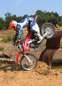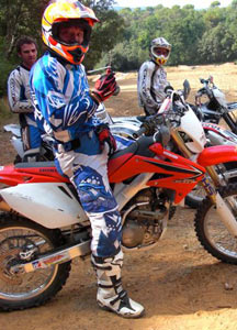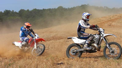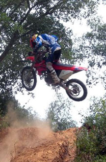 Tras los entrenos en el tramo cronometrado, Fuji se dedicó a darle al mango de su CRF en compañía de Jordi y más amigos y aprovechó algunos terraplenes para hacer locuras de las suyas, de las que nos deleita en eventos como la Montesada, pero a los mandos de la moto de enduro... piruetas en el aire, saltos...