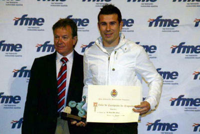 Trofeo de Campeón de España 2009 a Toni Bou, a quien vemos en la fotografía con Angel Viladoms.
