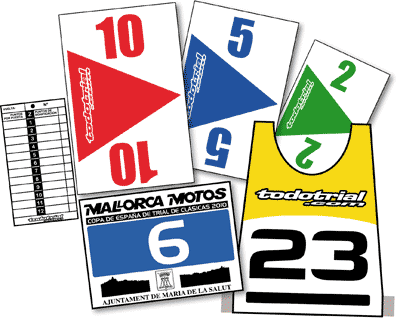 la organización de un trial como petos, tarjetas de pilotos, flechas